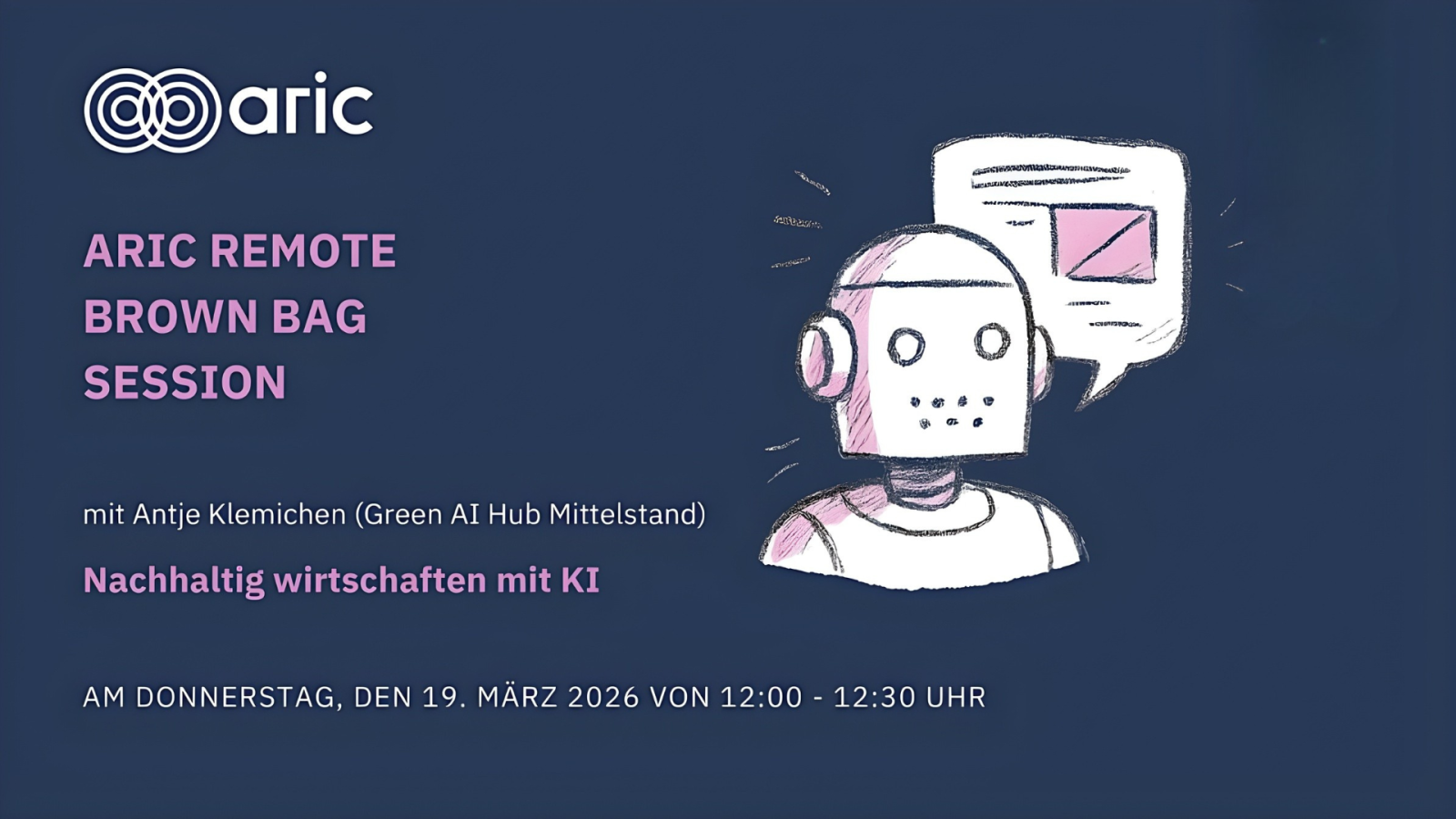 Am 19.03. findet die ARIC Brown Bag Session zum „Thema Nachhaltig wirtschaften mit KI" statt. Dort stellen wir den Green-AI Hub vor und zeigen, wie grüne KI-Anwendungen in der Praxis Unternehmen dabei helfen, Ressourcen und Materialien einzusparen und CO₂-Ausstöße zu reduzieren.